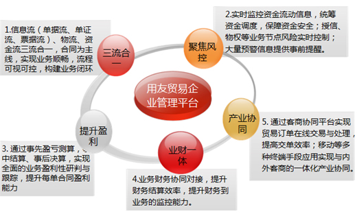 用友贸易行业信息化解决方案是用友在众多物资贸易企业信息化建设经验的基础上,结合现代贸易企业经营管理模式创新,利用最新的企业互联网信息技术,提供了全面、多模式的内外贸易最佳管理实践。