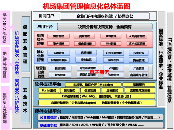 解决方案依赖于用友统一应用平台UAP,实现了提供一个统一的企业门户、两个安全保障体系、三级企业应用的先进架构,用友的机场解决方案和应用覆盖了机场集团综合管理的各个业务层面。