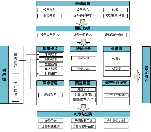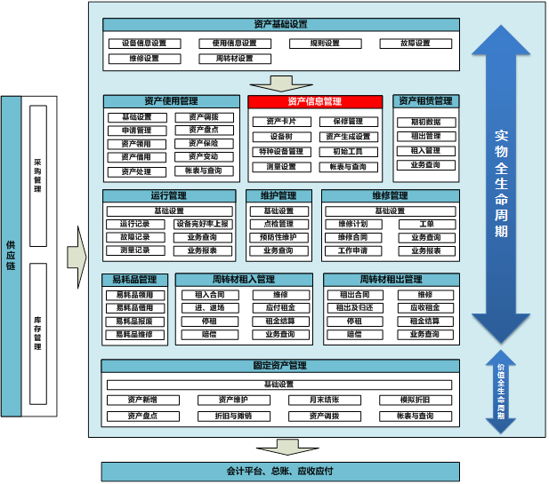 资产信息管理是以管理设备卡片为核心的应用模块,主要包括:管理设备卡片,各类设备台账以及提供特种设备、保修管理、测量设置、初始工具等相关业务管理;它是企业资产全生命周期管理的基础。资产使用、运行、维修过程中的绝大部分业务,都涉及对设备卡片进行相关信息的回写,所以可以通过设备卡片了解设备整个生命周期的绝大部分信息。